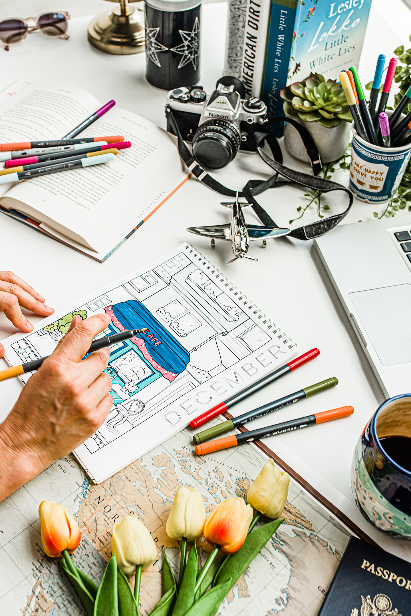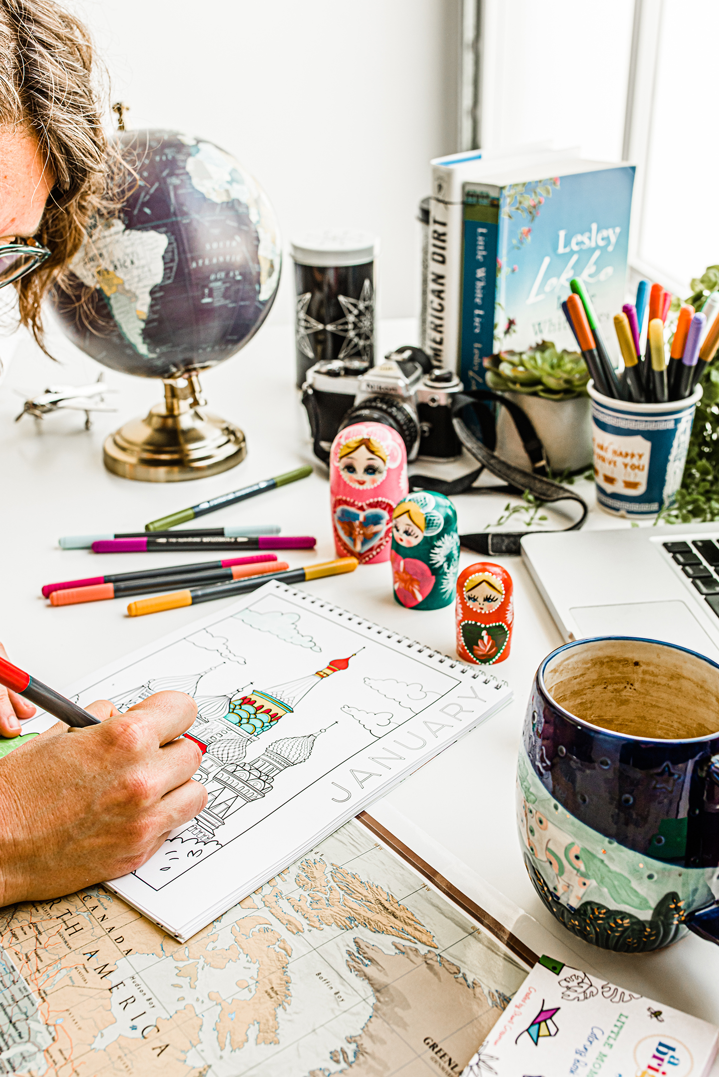 A Brighter Year coloring book is here to help color your world - one day at a time! This Travel The World themed coloring book lets you travel to far off places from the comfort of your couch! Each adorably designed coloring page aligns perfectly with a month of the year. Search for the day of the month and enjoy coloring a small piece of the big picture every day. At the end of each month, you’ll be left with a beautifully completed work of art!