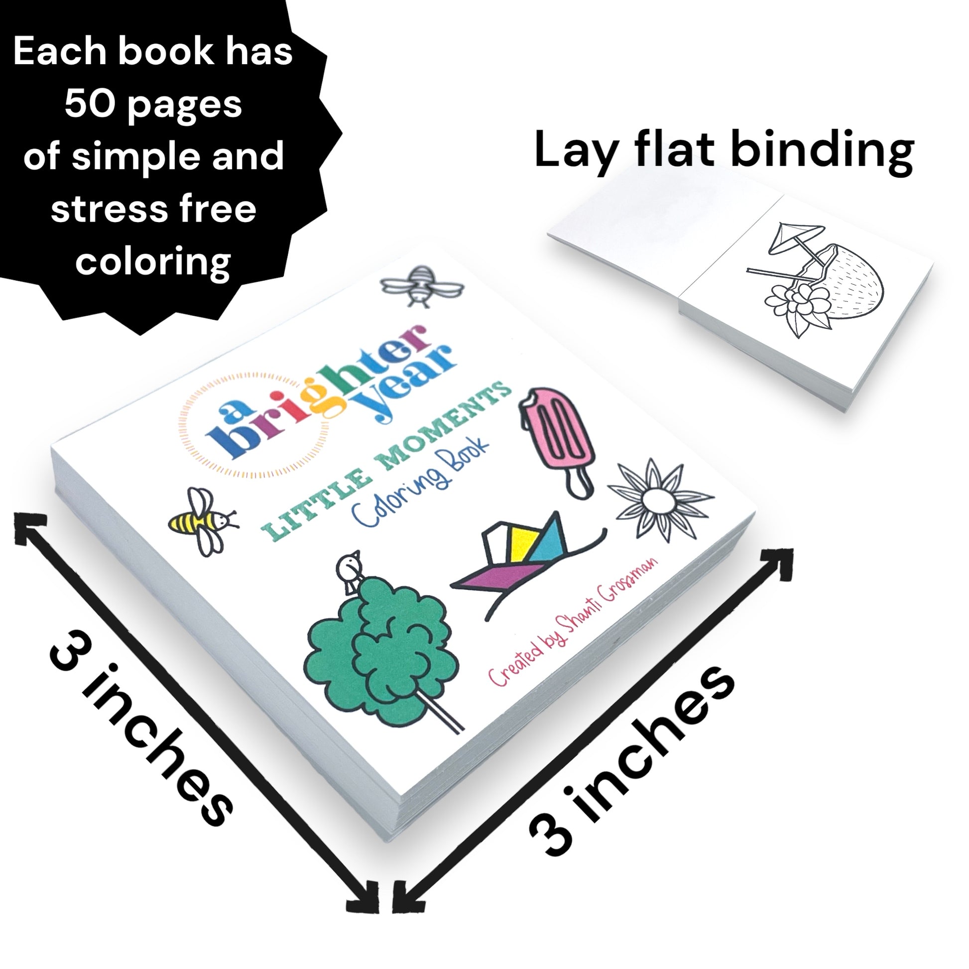 Get your daily dose of color with this Little Moments coloring book from A Brighter Year. Color your world - one moment at a time with this small 3 inch x 3 inch coloring book. Each adorably designed coloring page takes just a few moment to color, leaving you relaxed, refreshed and rejuvenated. It is perfect for adults looking to get their daily dose of zen, or children looking for a few moments of creative fun!