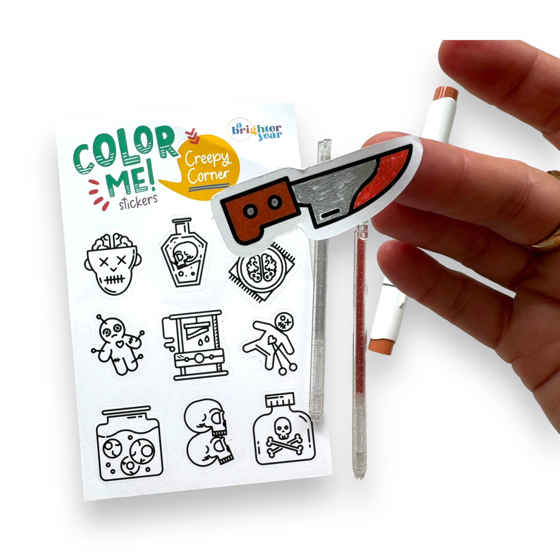 Cute meets macabre with our Creepy Corner Color-Your-Own Stickers! Let loose your love for spooky season, and indulge in a little creepy coloring time.