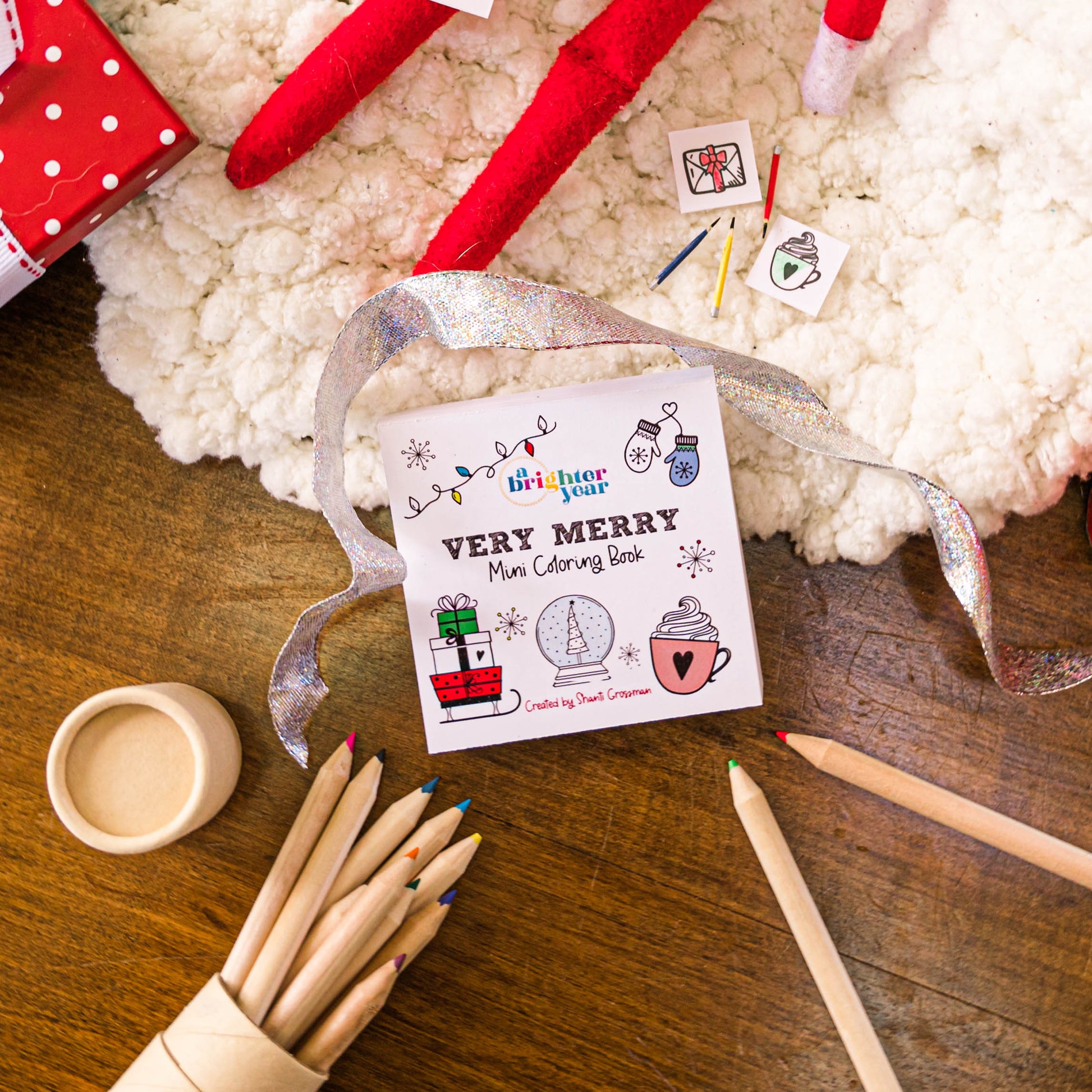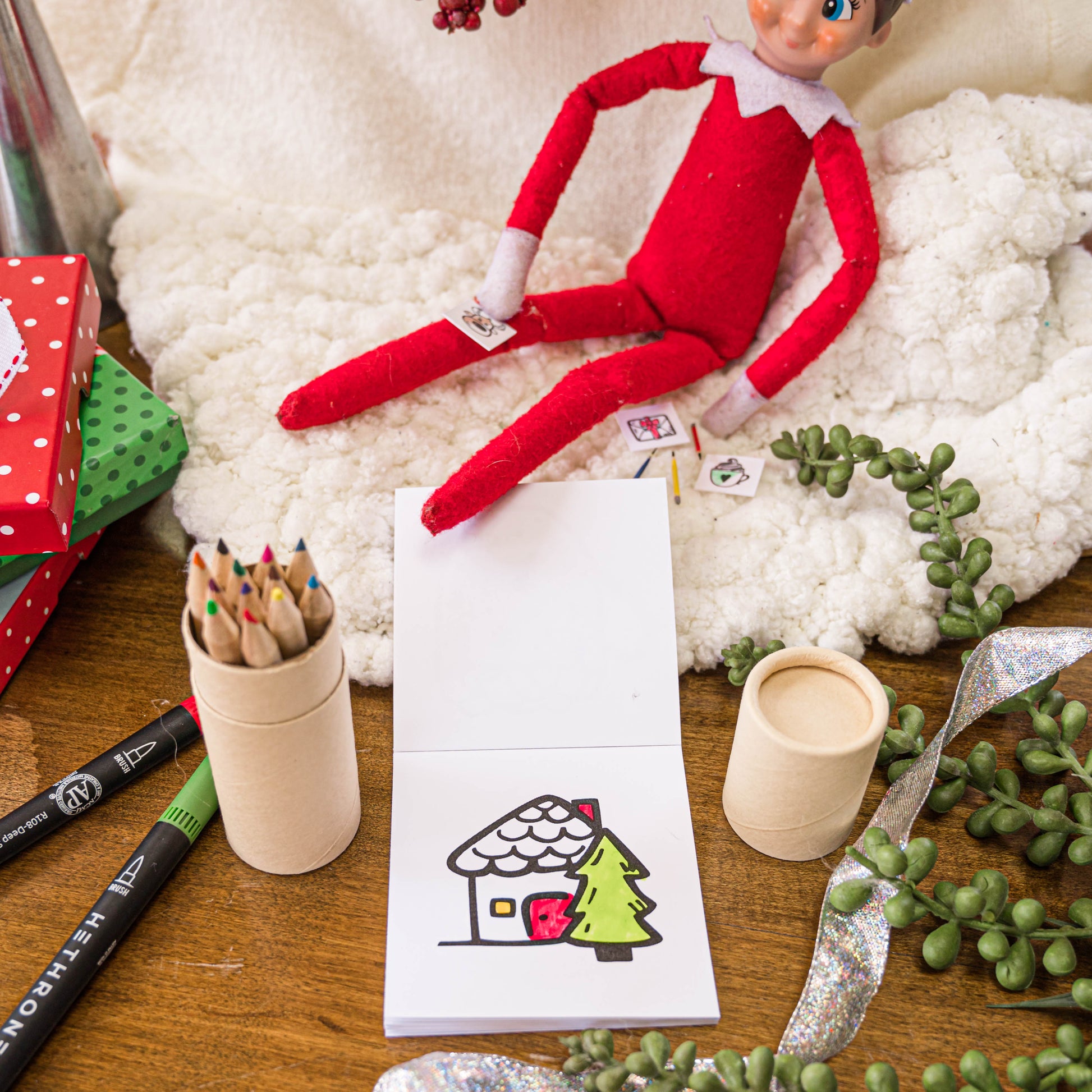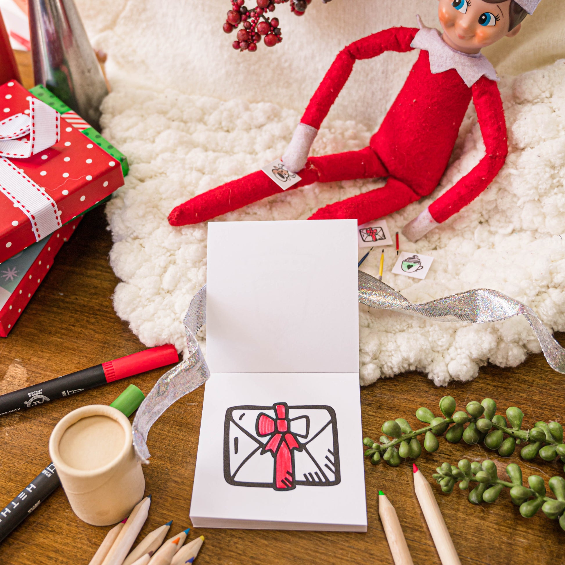 Your little ones will squeal with delight when they wake up to find their Elf has delivered a mini coloring book for them to color all season long with pages to match the mini pages the Elf is coloring themselves with the tiniest mini prop colored pencils!