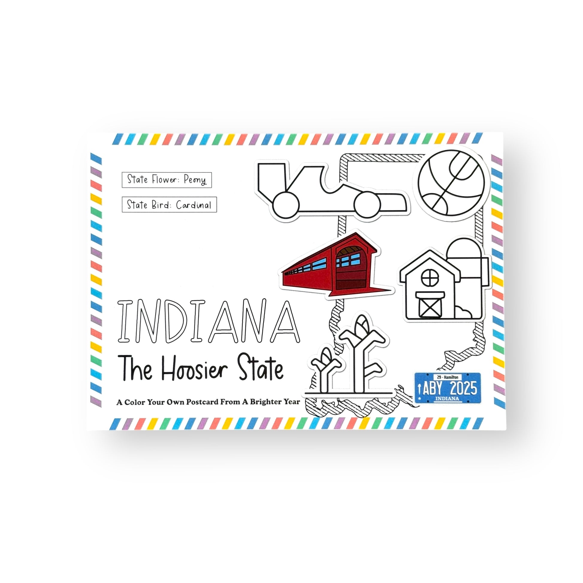 Covered bridges, racecars, and basketball dreams—it’s all here on this Indiana postcard. Packed with classic Hoosier vibes and a few nods to state staples like the peony and cardinal, this one's ready for some color and hometown pride.