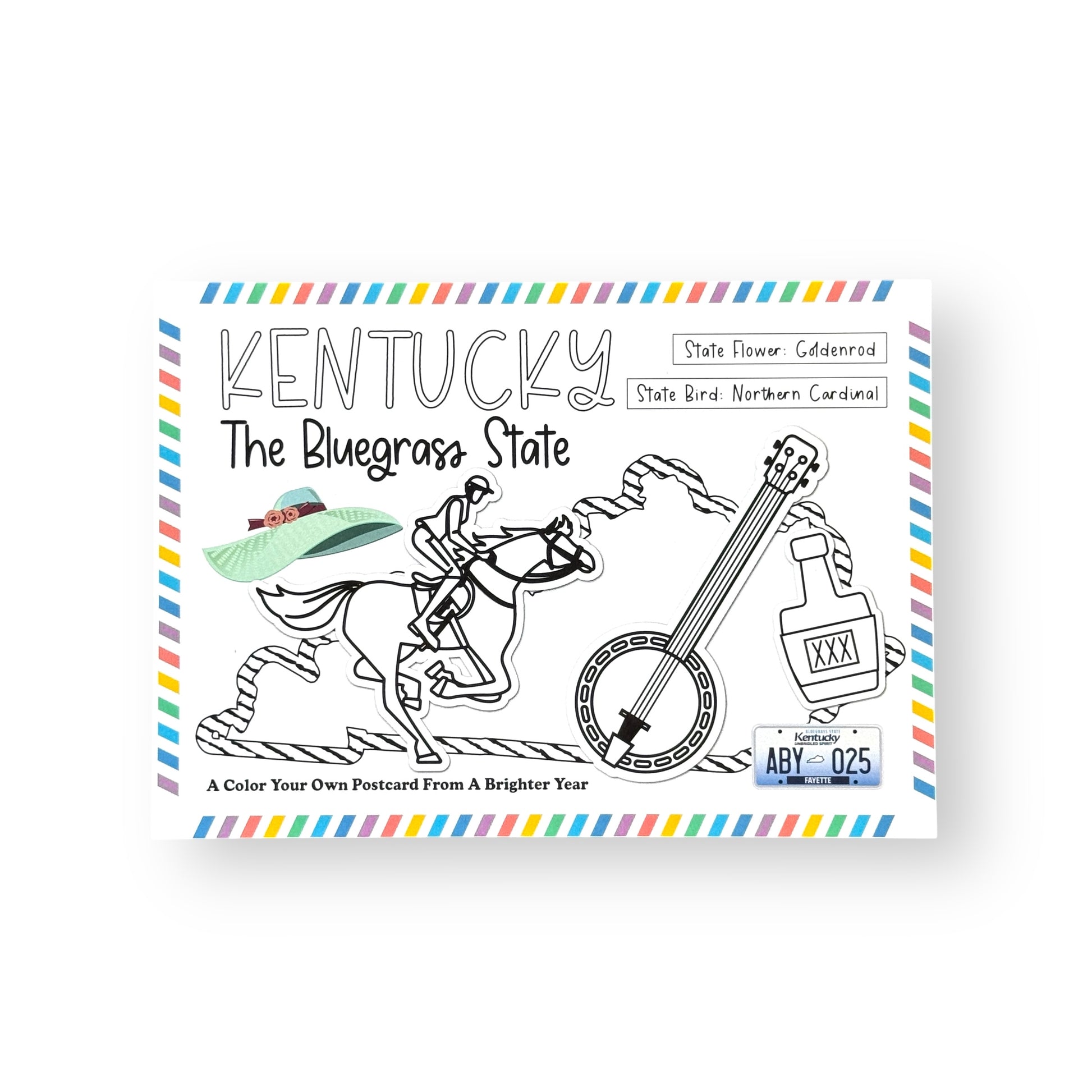 Fast horses, big hats, and plenty of banjo plucks—this Kentucky postcard is ready to race. From bourbon bottles to goldenrods (the state flower, listed by name), it’s packed with charm, rhythm, and a dash of moonshine mischief.