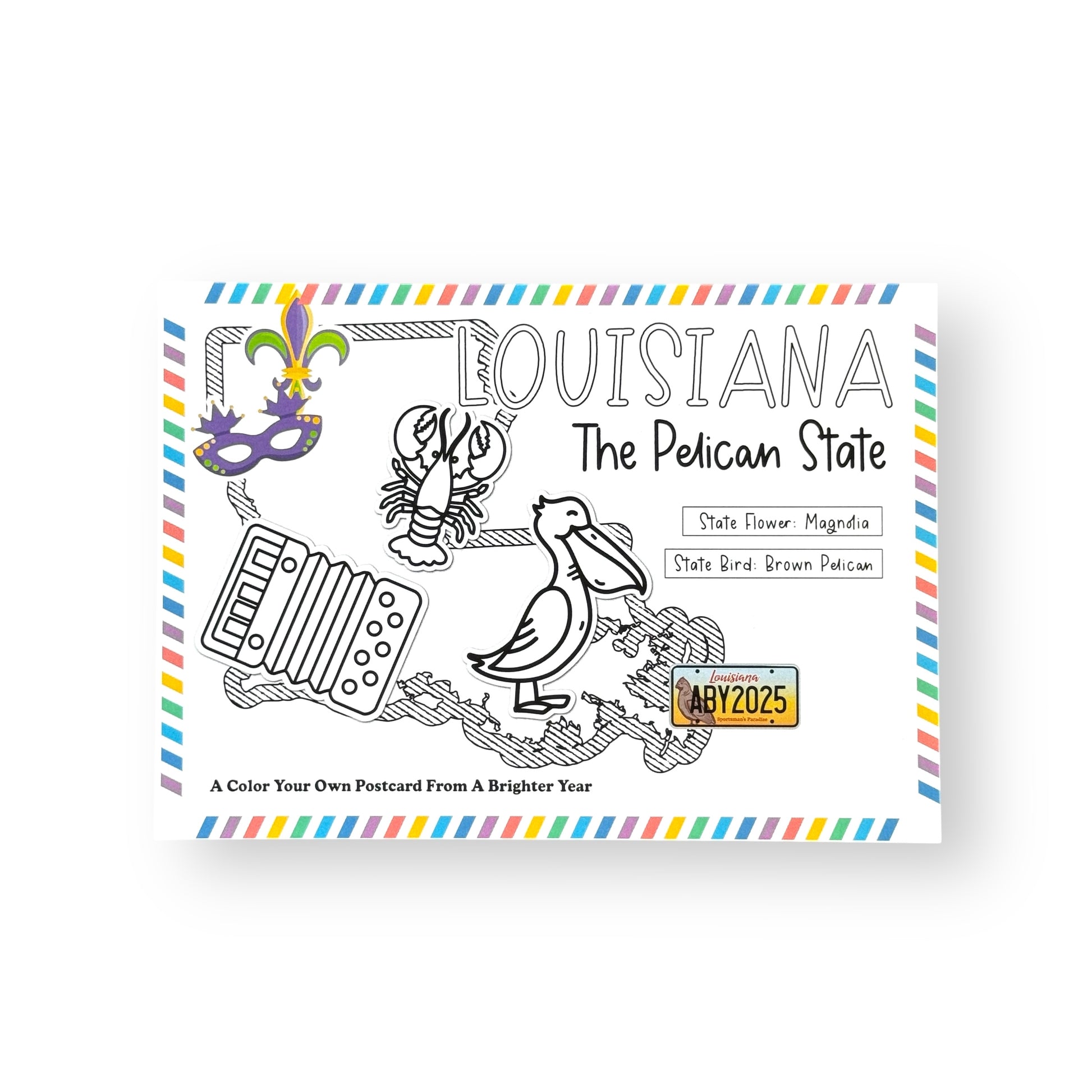 Crawfish, accordions, Mardi Gras masks—this Louisiana postcard is a party waiting to happen. It gives a nod to the state’s official bird and flower by name, but the real star is the flavor: spicy, soulful, and a little loud (in the best way).
