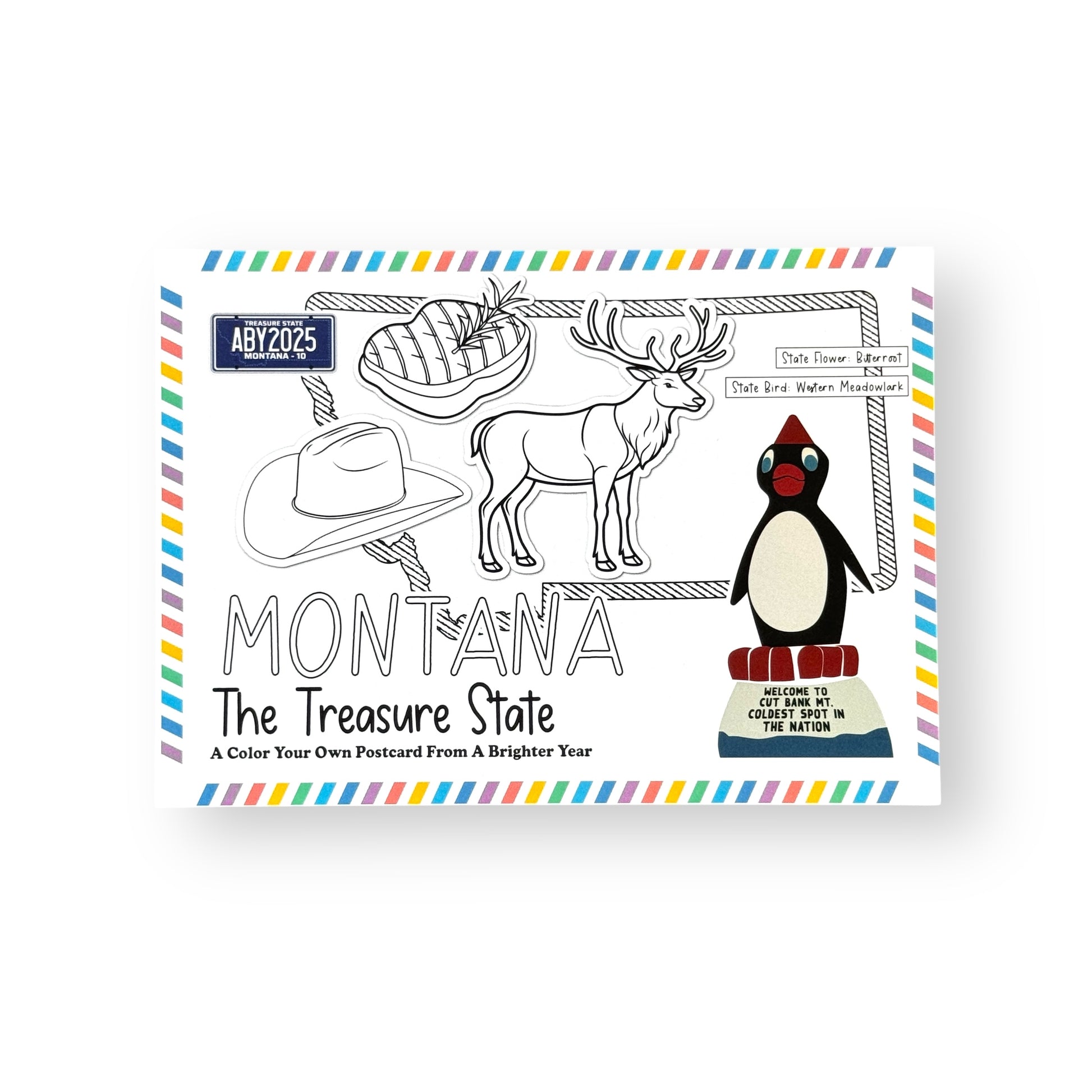 Big sky. Bigger elk. And a penguin? Yep—Montana’s postcard has personality, from cowboy hats to Cut Bank’s chilly mascot. Color it all in, and don’t miss the namedrops for the Western Meadowlark and Bitterroot flower, two state icons worth knowing.