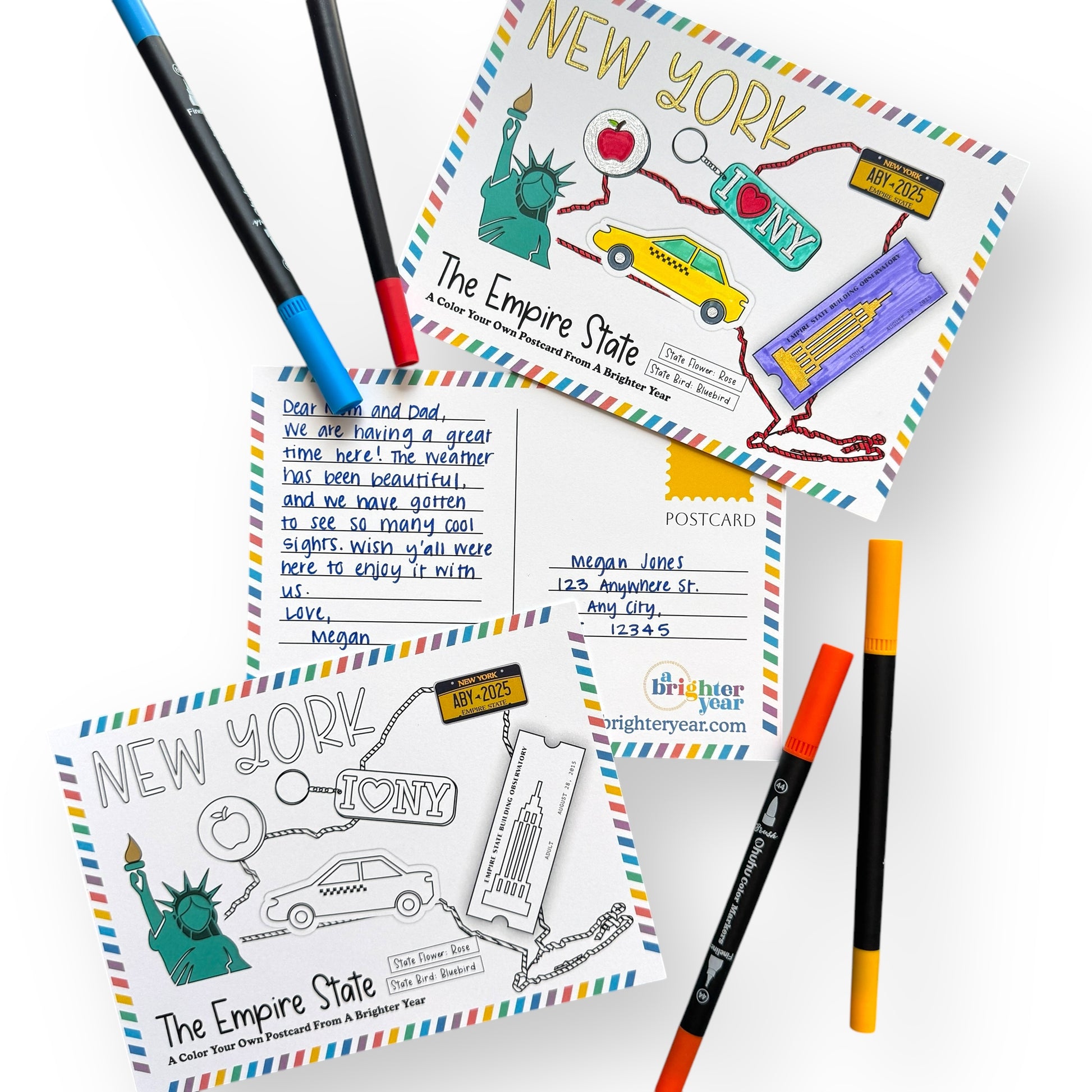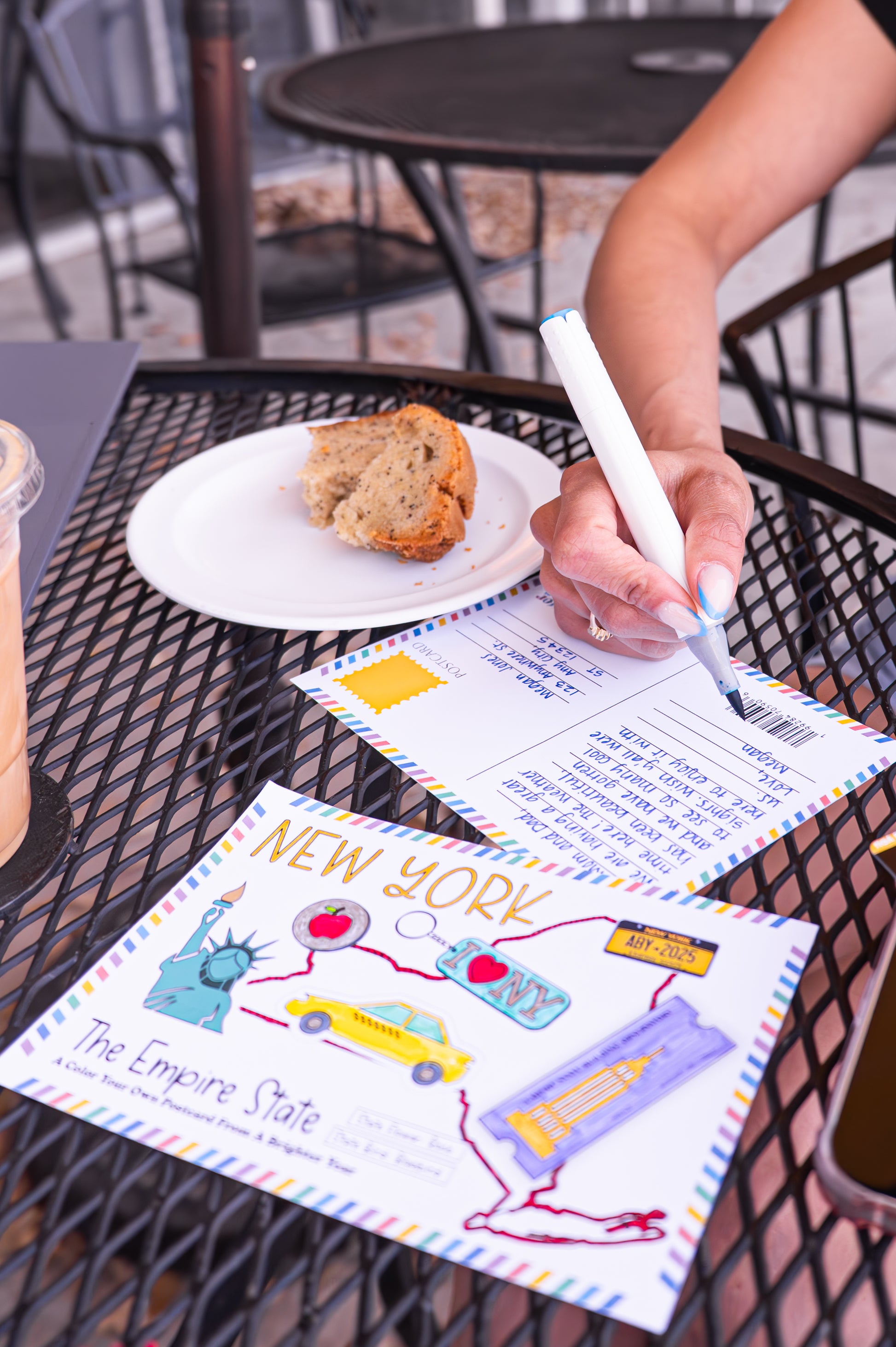 Skyscrapers, taxis, apples, and “I ❤️ NY”—this one’s a classic. This color-your-own postcard is bursting with iconic Empire State moments, with nods to the Rose and Bluebird tucked in to round out your New York know-how.