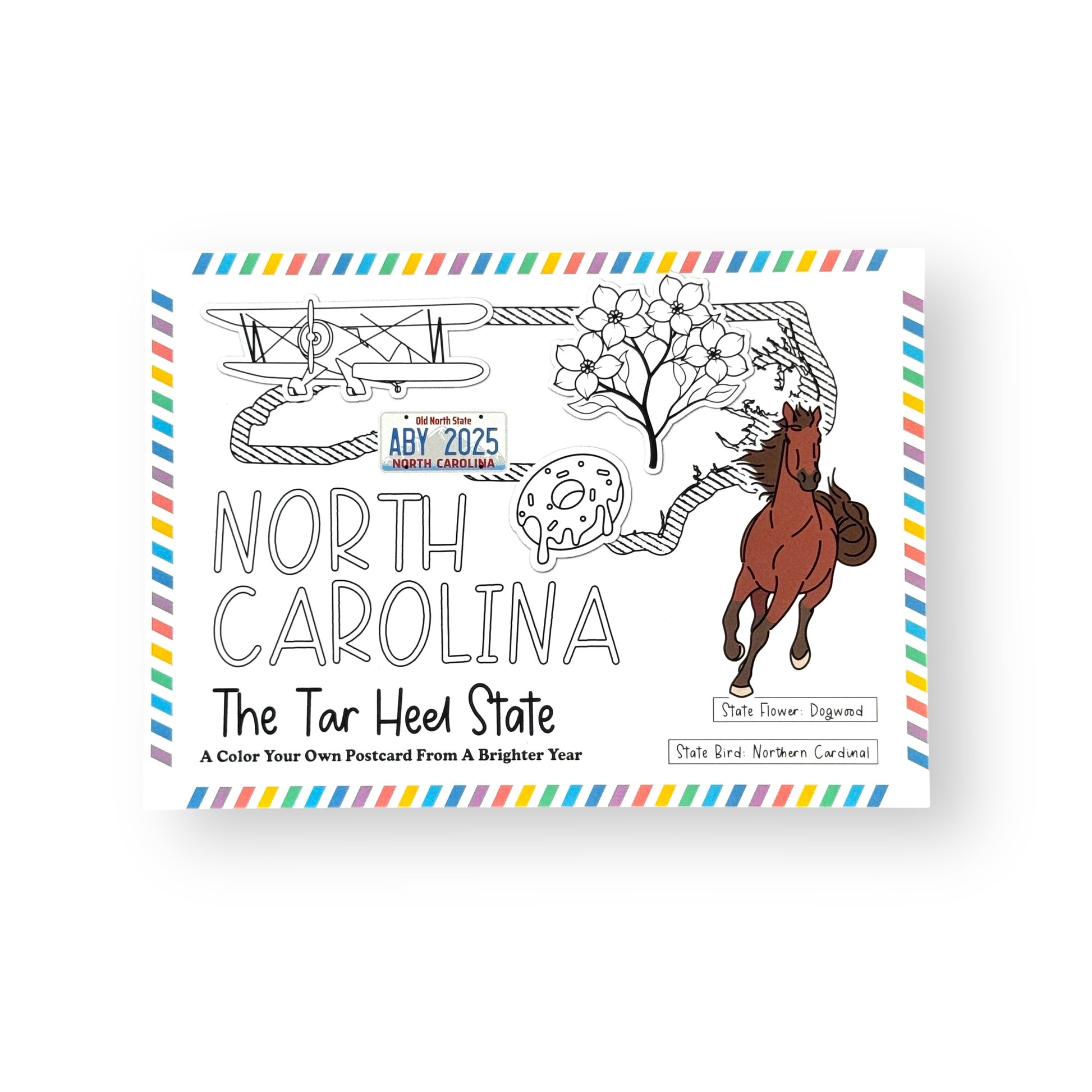 From wild horses to flying machines to fresh donuts, this postcard captures North Carolina’s charm in every corner. A perfect pick for color-loving adventurers, it also drops the names of the Dogwood and Northern Cardinal—two local legends worth knowing.