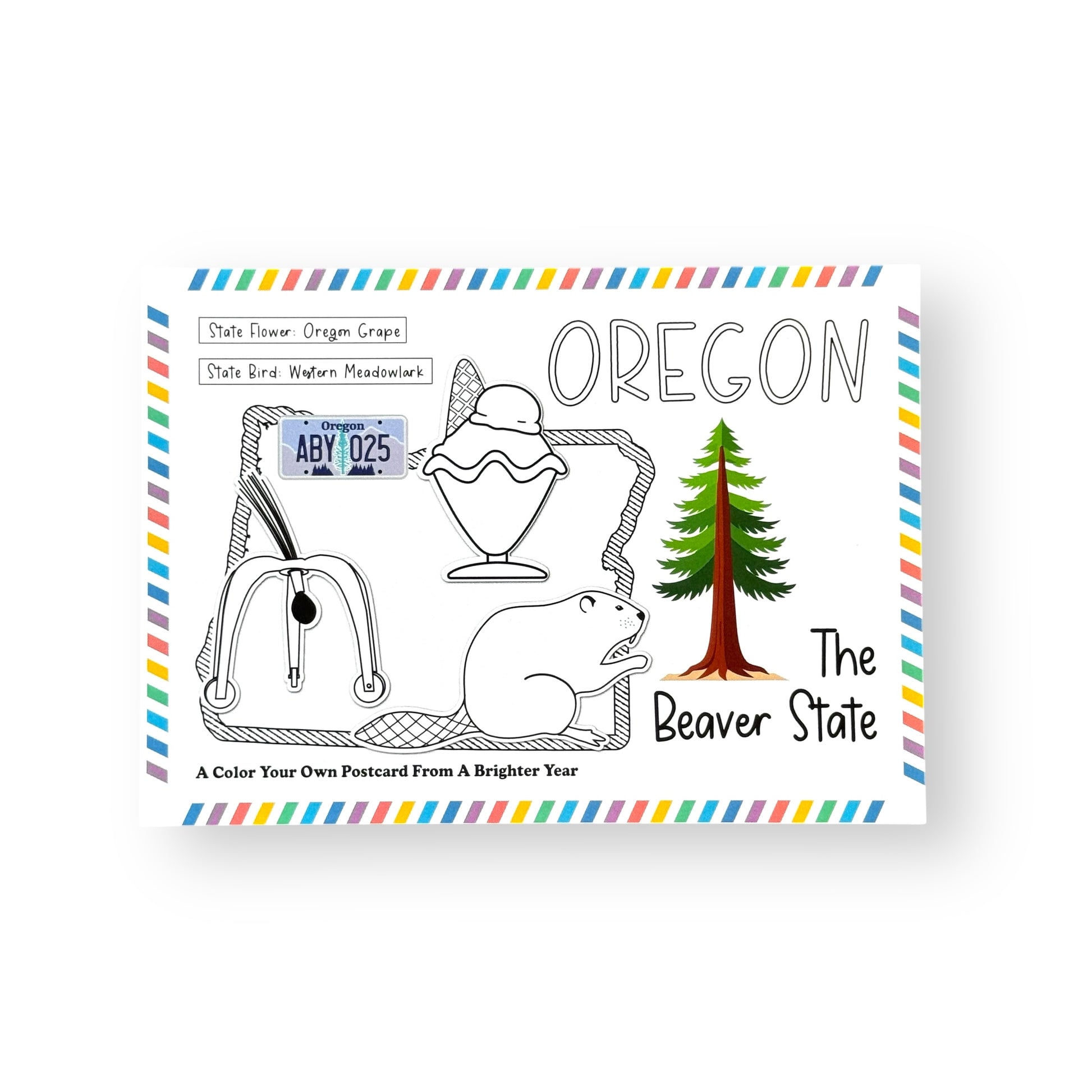 Celebrate misty trails, towering trees, and sweet summer treats with this color-your-own Oregon postcard. Featuring a beaver, iconic drinking fountain, towering evergreen, and a scoop of ice cream that’s always in season. Plus, it proudly calls out Oregon’s state bird and flower by name—just in case you’re brushing up on your trivia while you color.