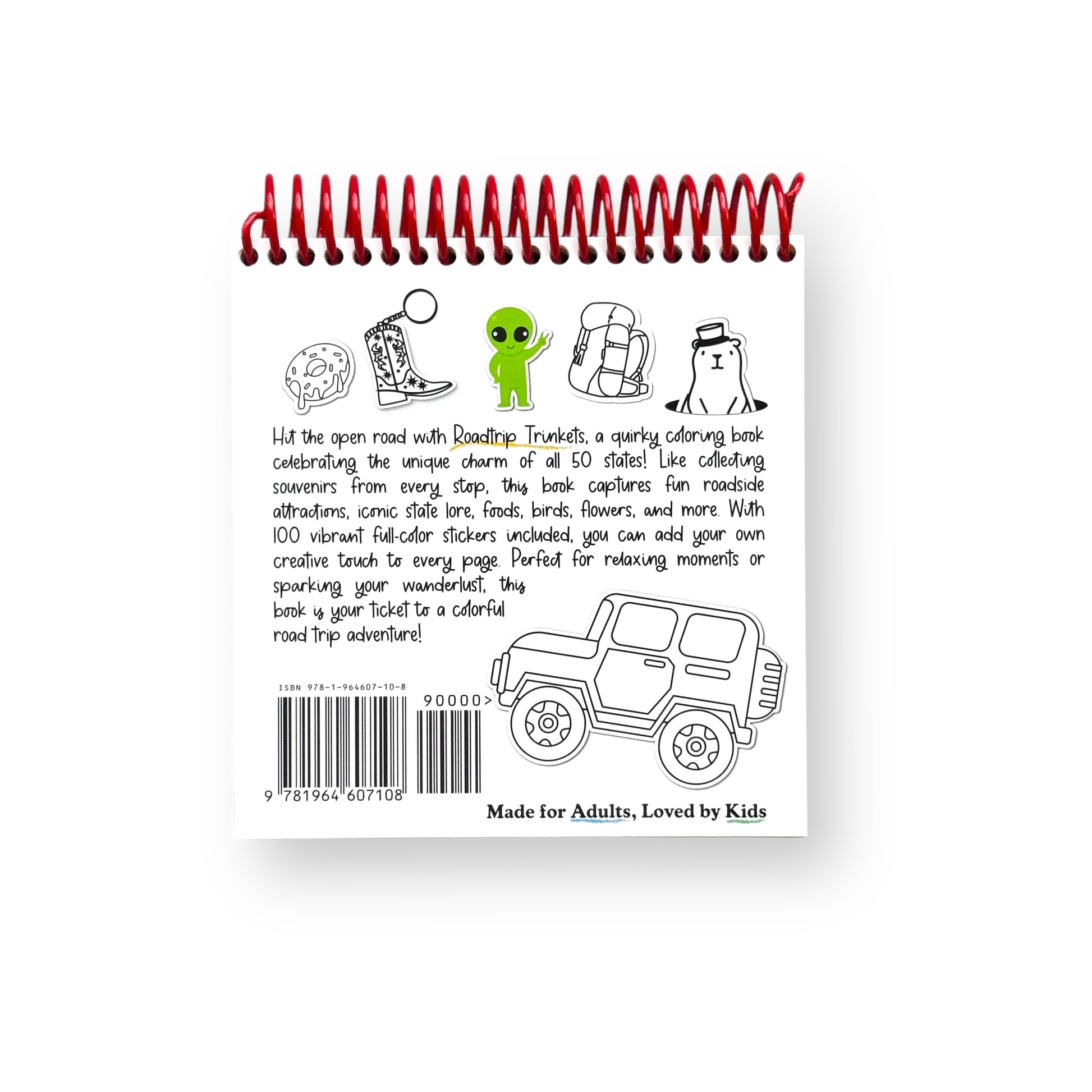 Color your way across America with this vibrant, sticker-filled travel activity book! Roadtrip Trinkets is a spiral-bound coloring adventure that celebrates all 50 states (plus Washington D.C.) with whimsical artwork, roadside landmarks, and regional treasures just waiting for your creative touch.
