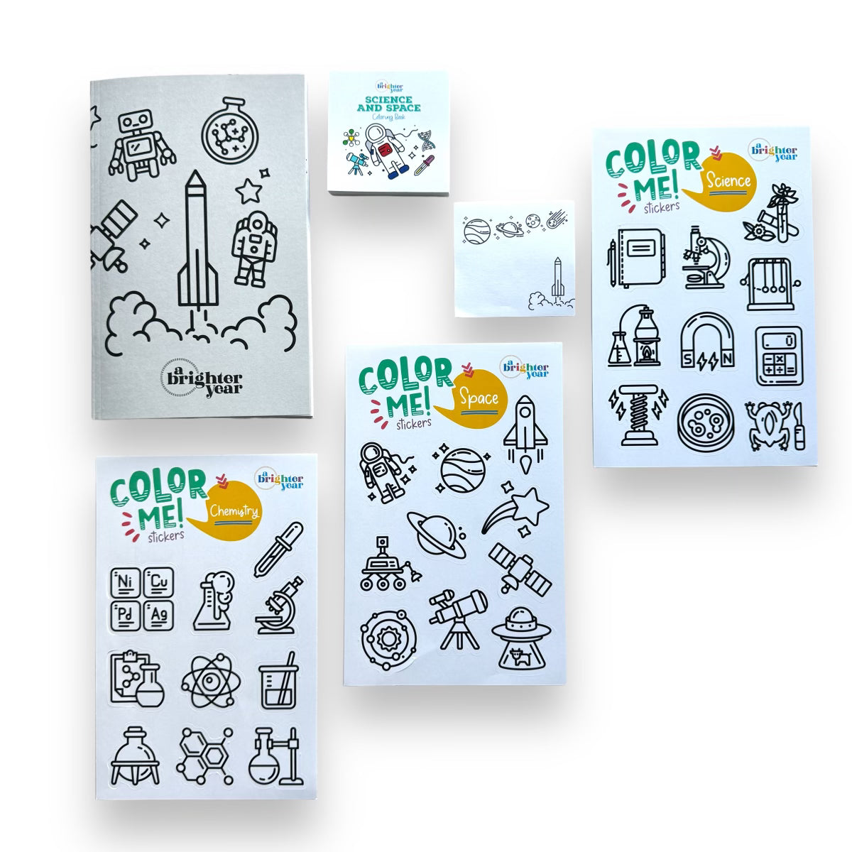 - Color-You-Own Sticker sheets include 10 space themed stickers, 10 chemistry themed stickers, and 10 biology themed stickers (30 stickers total)