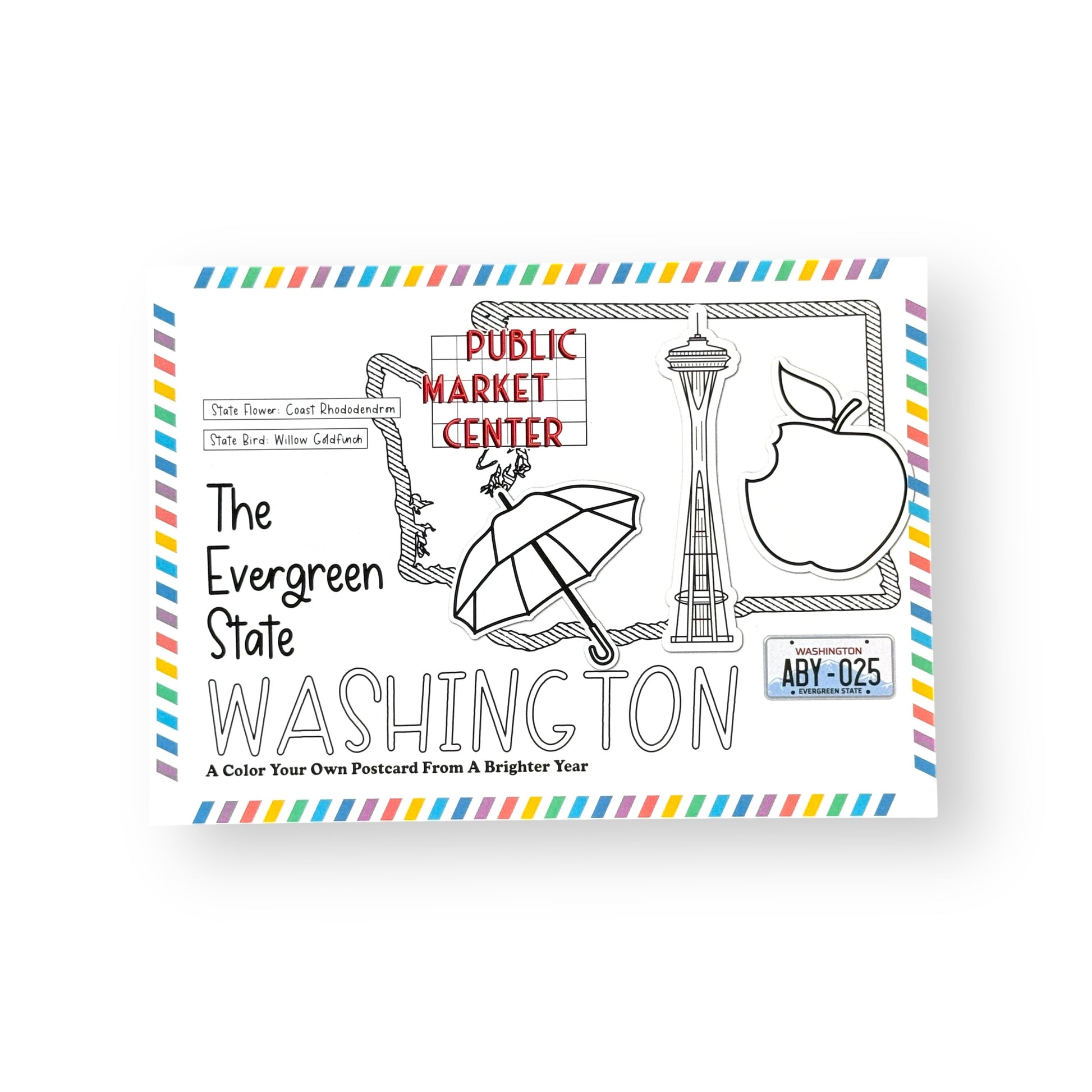 From towering evergreens to towering lattes, this color-your-own Washington postcard brings the best of the Pacific Northwest to life. Iconic sights like Pike Place Market, the Space Needle, and a classic rainy-day umbrella invite your creativity to shine. Add a splash of color and send a note as fresh as the Seattle air.